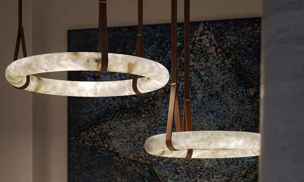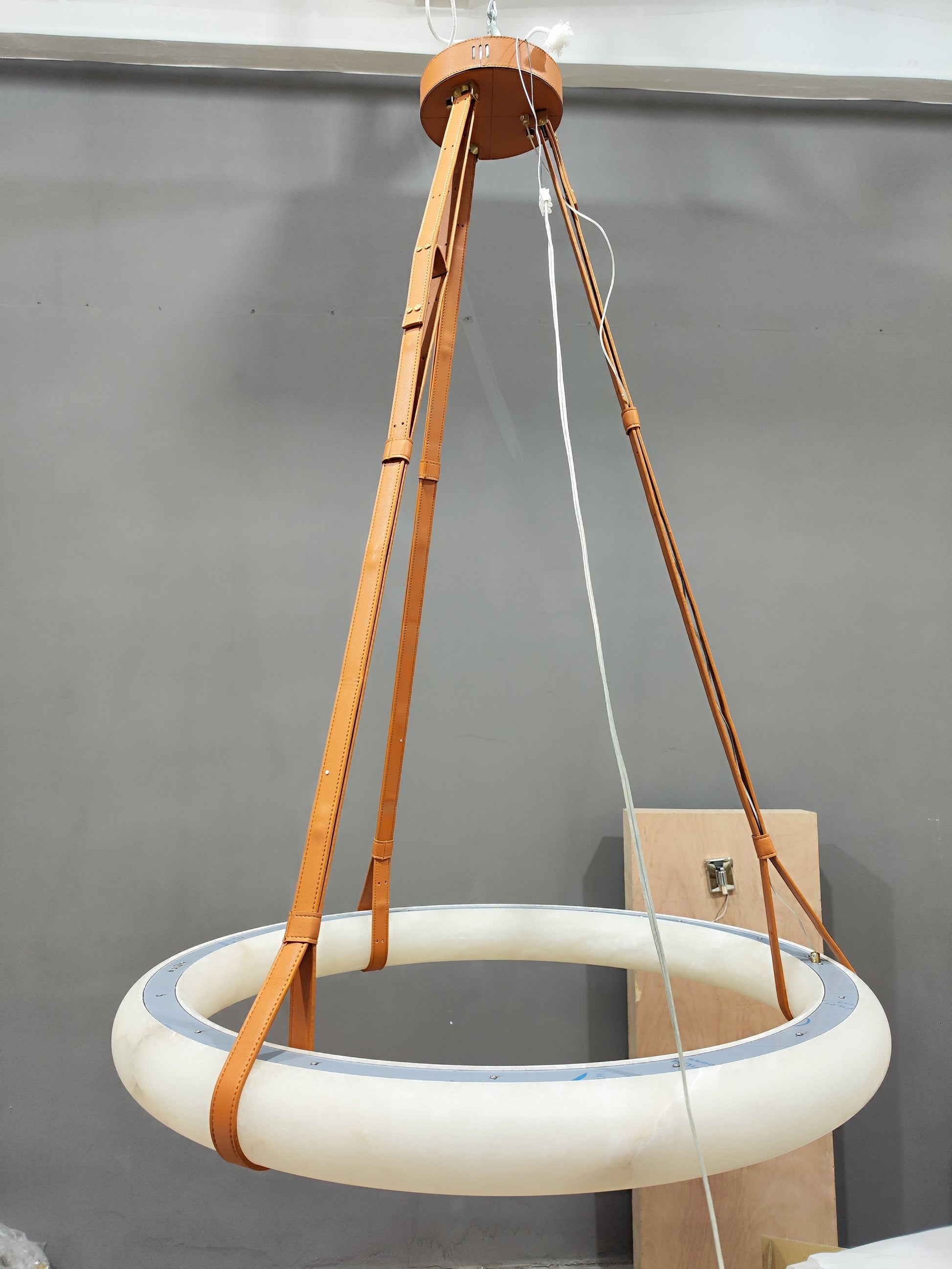 The Ring Pendant light composed of the alabaster rings, and the straps. The straps are made of leather and the color is picked out from various options, makes this alabaster pendant light shines like the luminous halos.