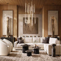 Capturing the spirit of 1960s Italian minimalism, Audubon appears to cascade from above with ten prisms of hand-polished K9 crystal on vertical brass drops. At once striking and restrained, the collection is the warmth of candlelight with elongated LEDs that shed beautiful light through the undulating texture of the glass.