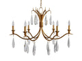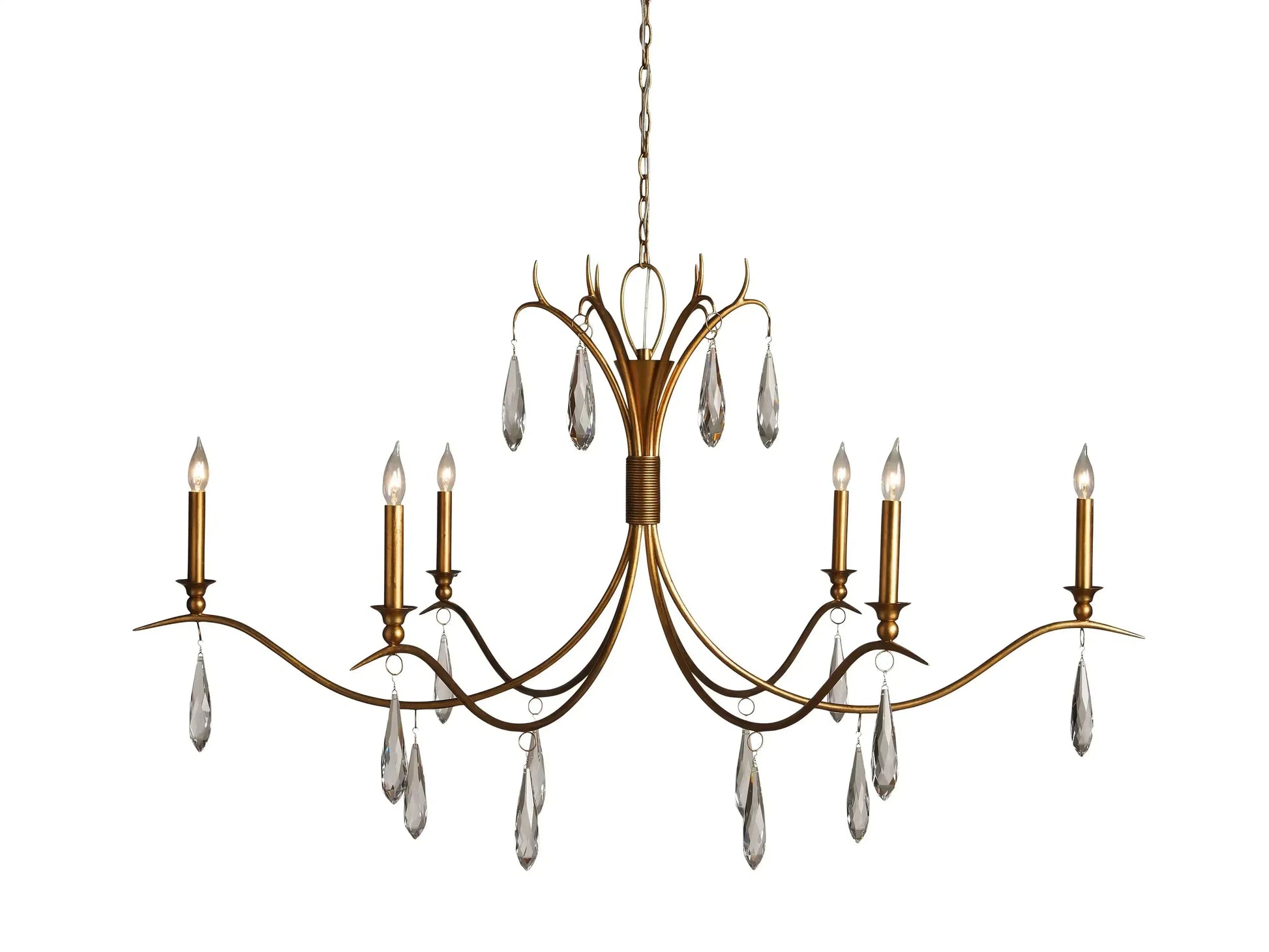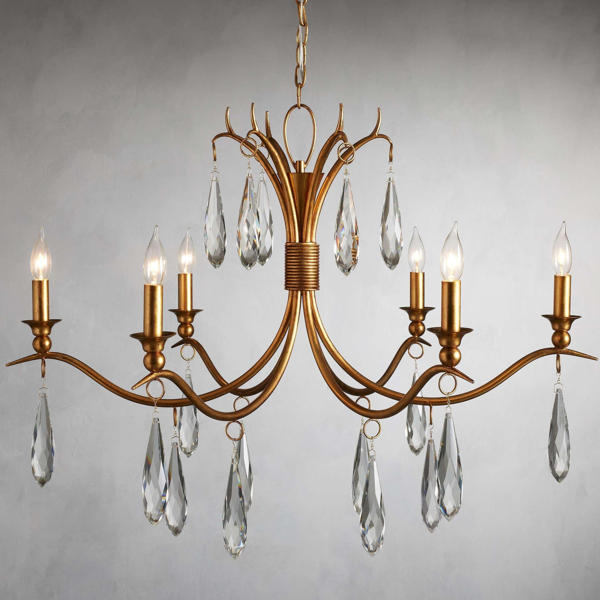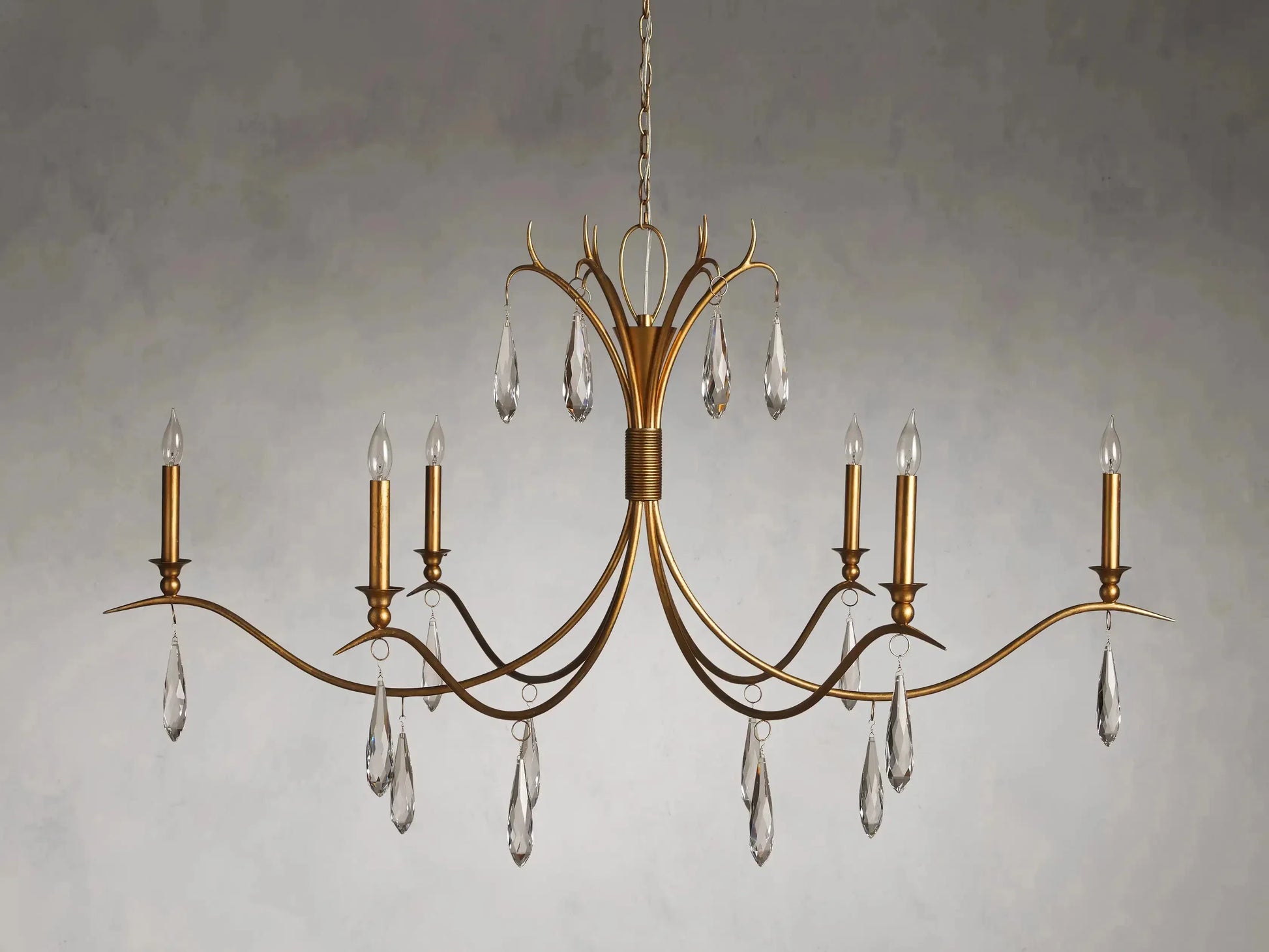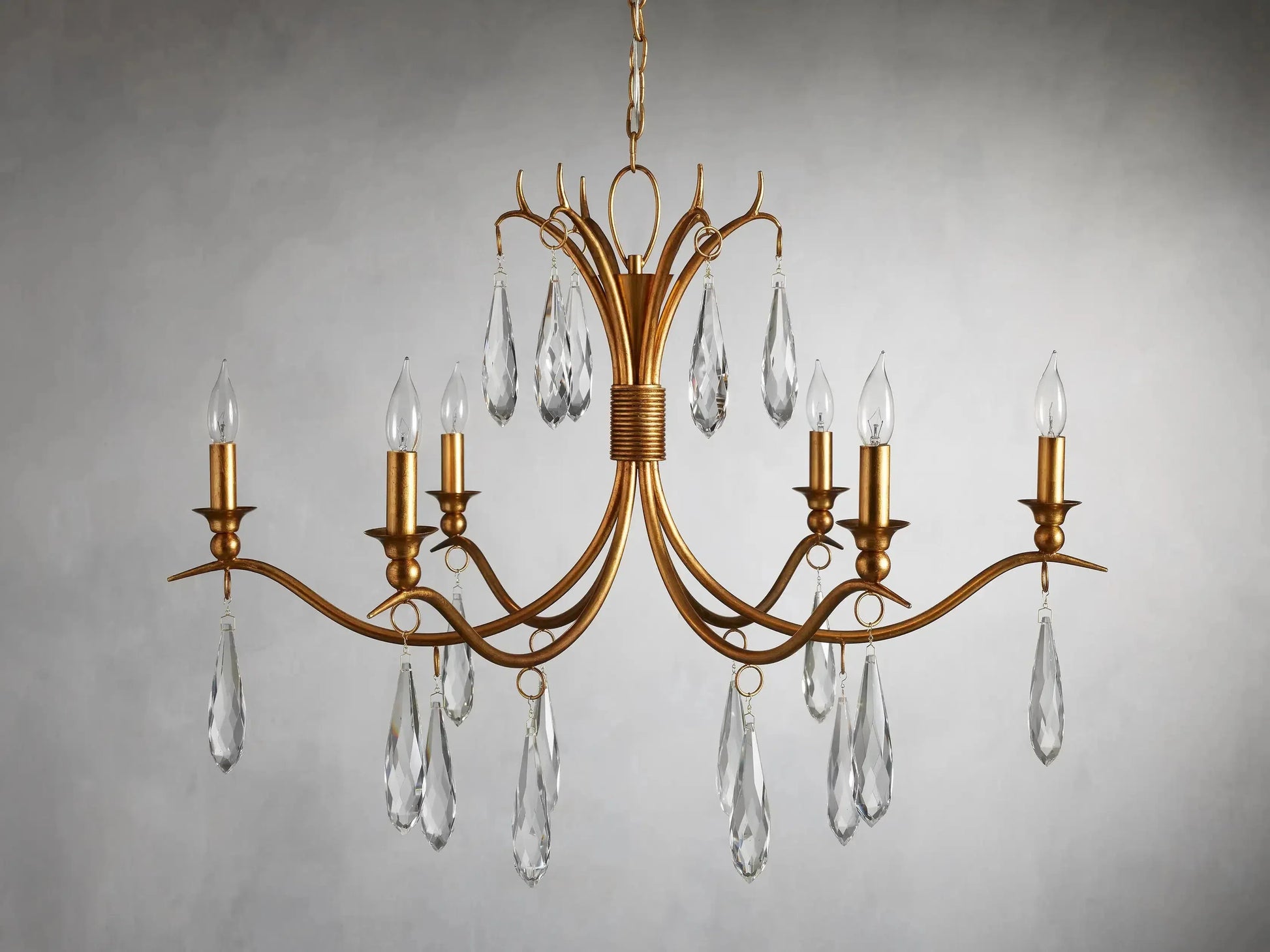 • Our stunning Celine Chandelier is adorned with 18 crystal drops that shimmer when illuminated. Its grand scale and warm, gold leaf finish make Celine a focal point in any home.