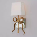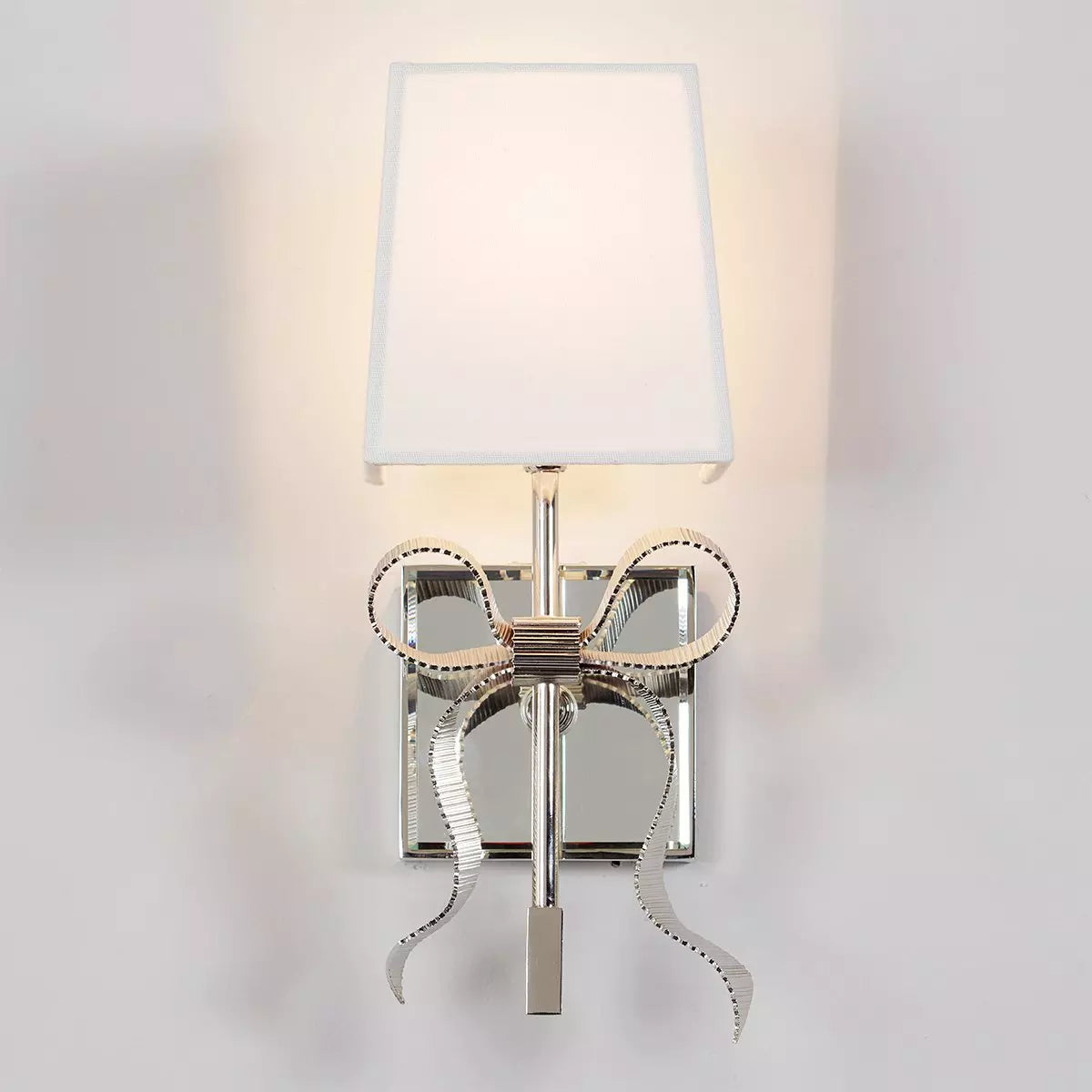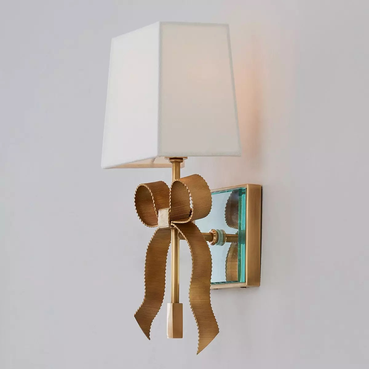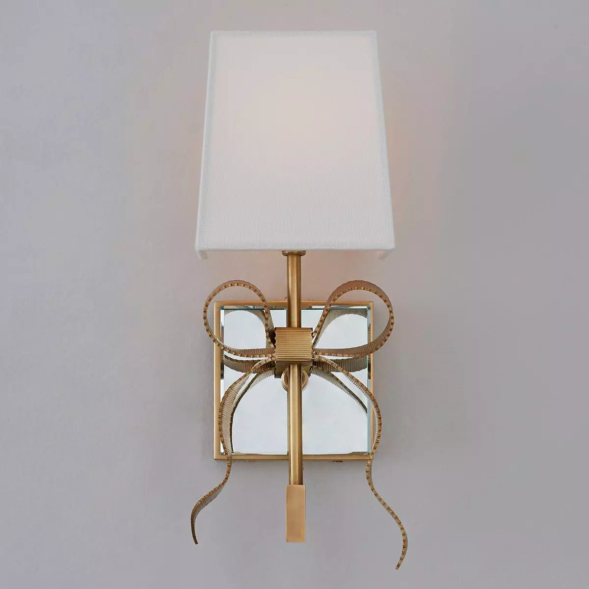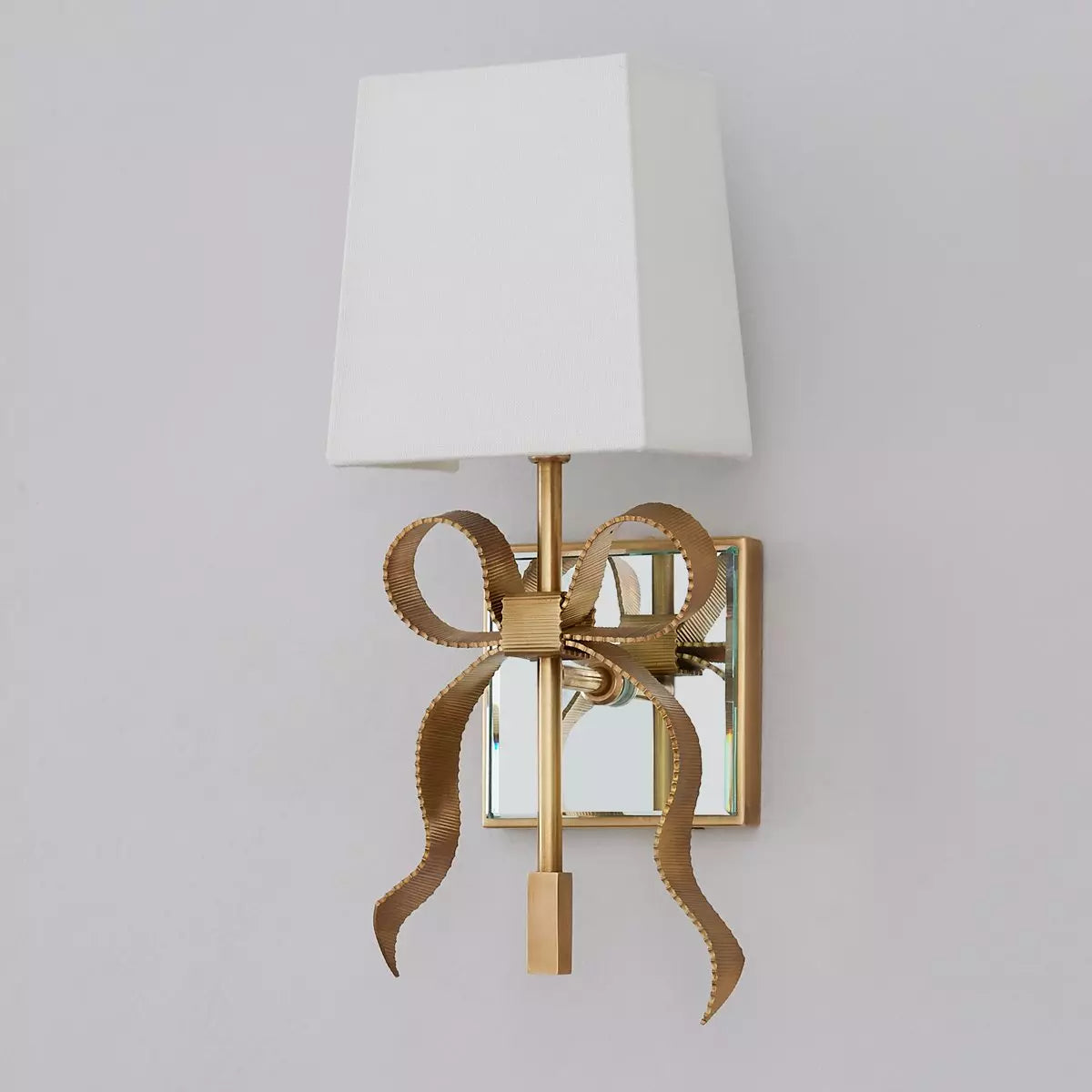 This whimsical sconce, designed for the kate spade new york collection, features a bow paired with a mirrored backplate and tapered Linen shade for a playful yet refined fixture perfect for adding stylish joy to any room.