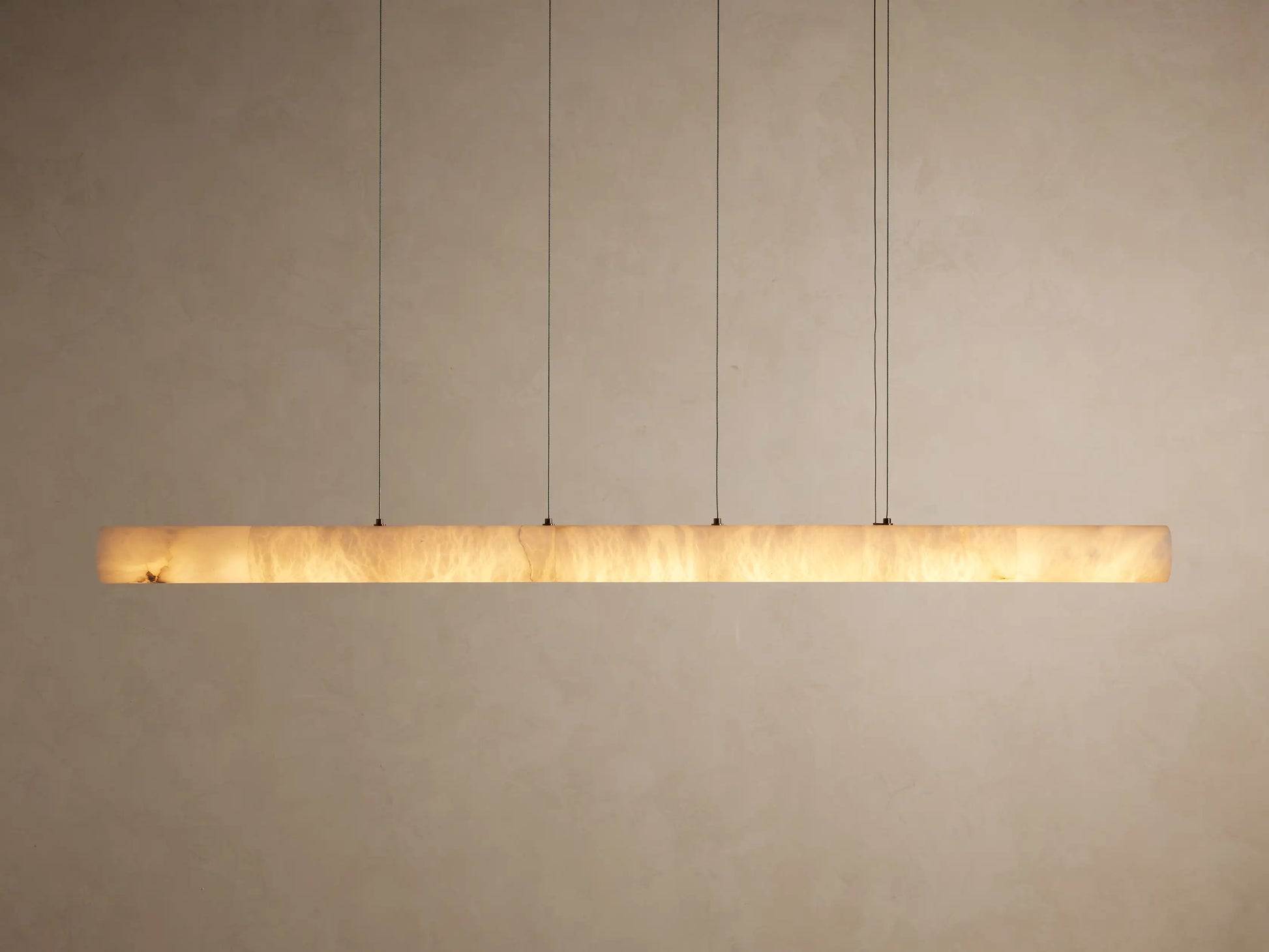 Crafted from ethereal Spanish alabaster, our Harryber Lighting Collection glows from within—its integrated LED lights casting a warm, diffused radiance through the stone’s natural veining. Suspended by minimalist cables, Halima’s sleek design floats effortlessly overhead, blending timeless materiality with modern style.