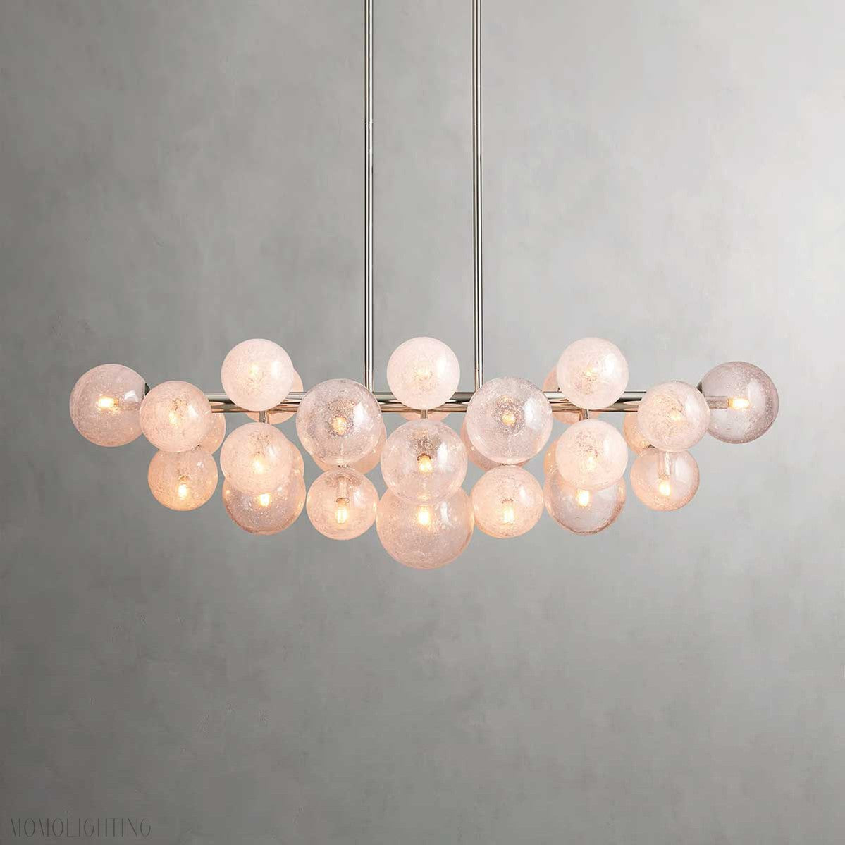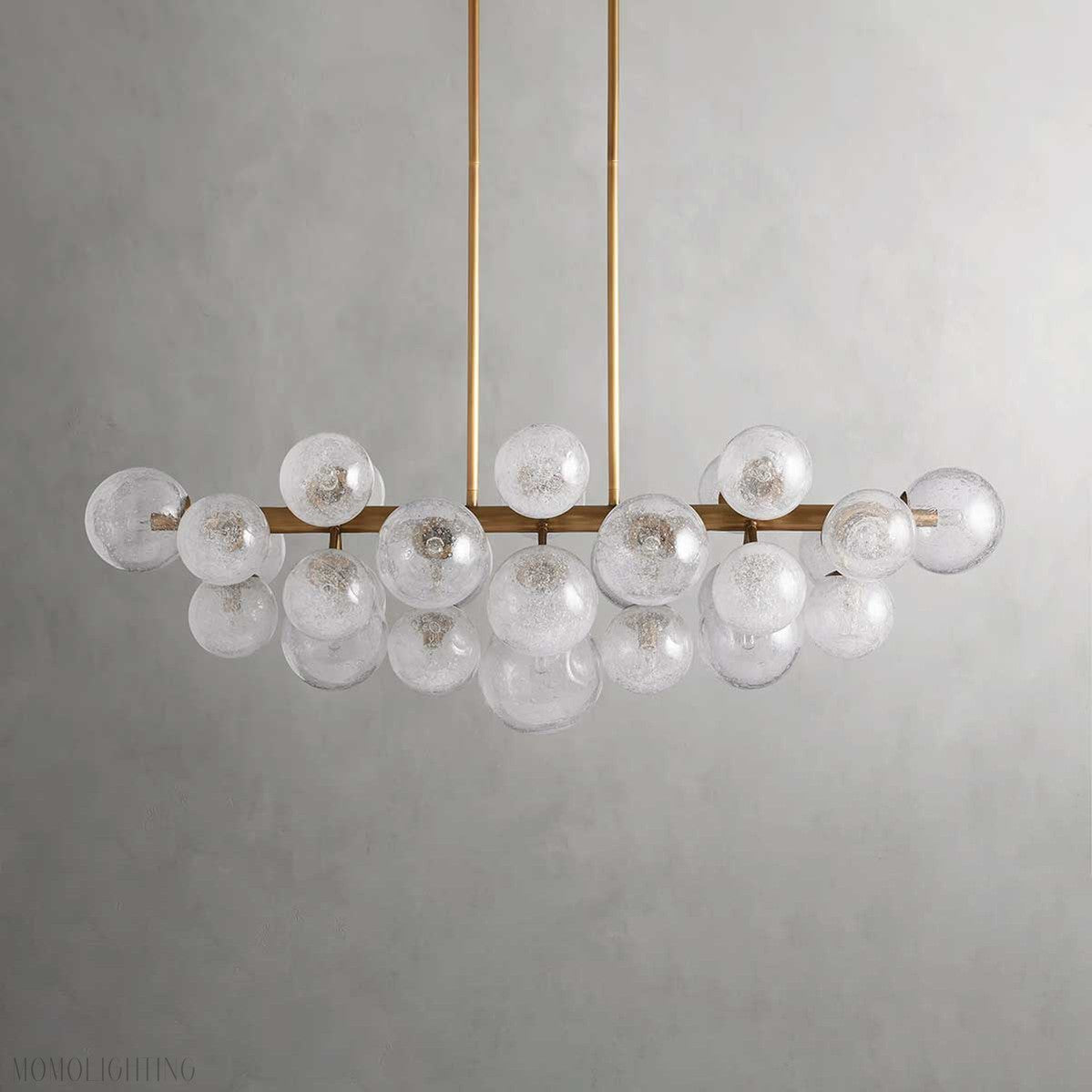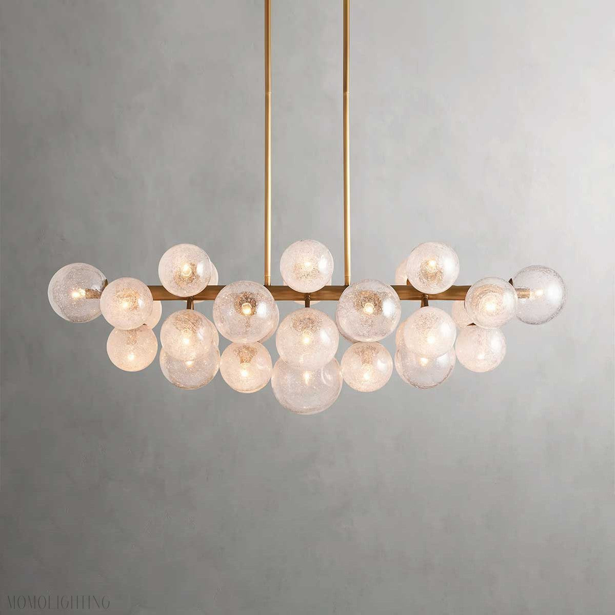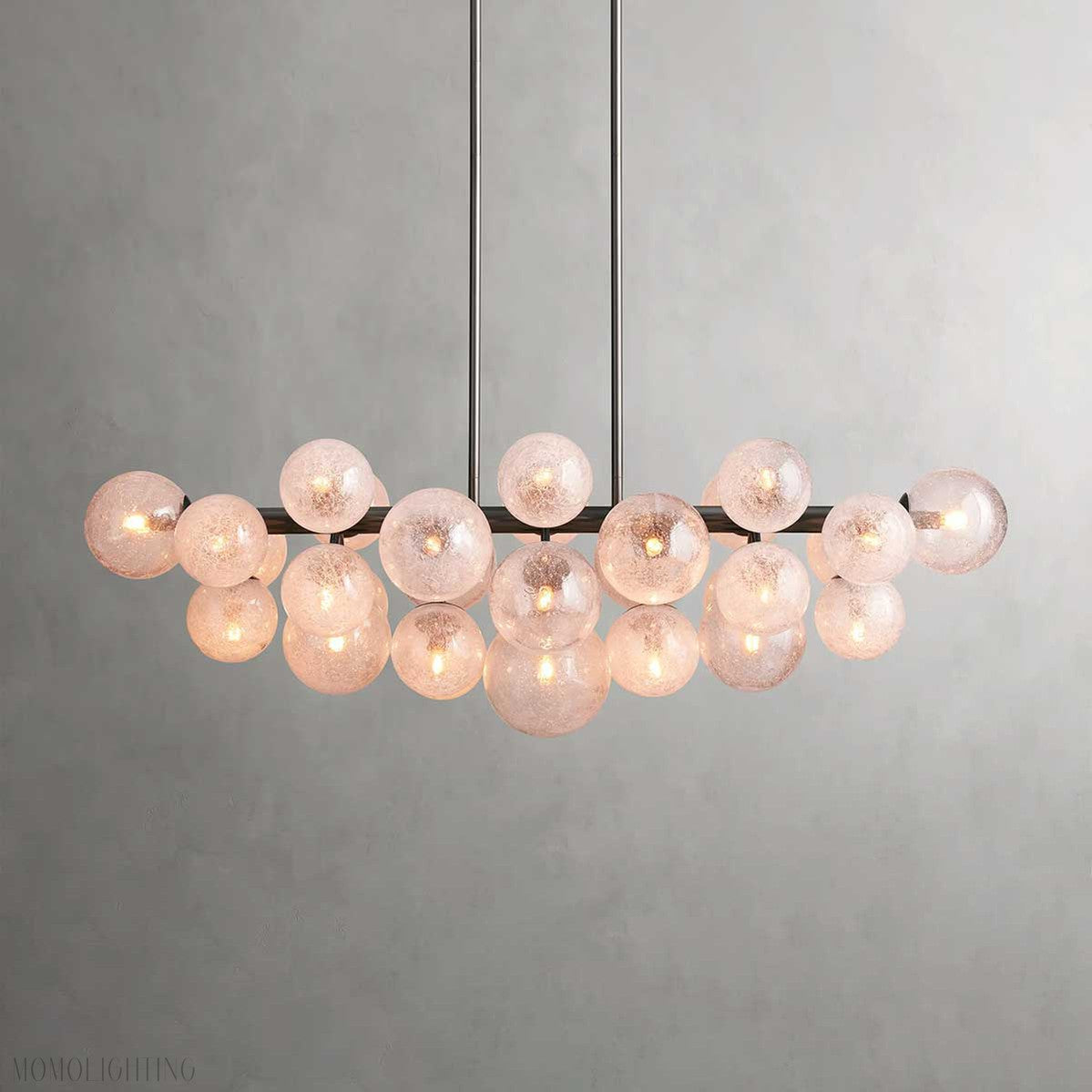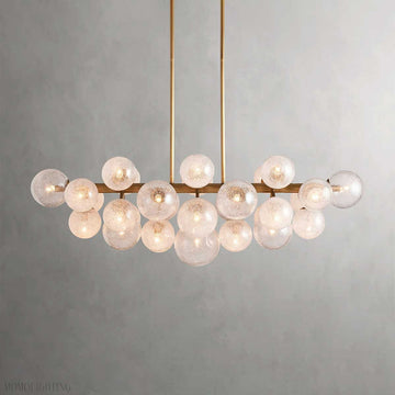 A fusion of rustic charm and industrial design, our Mandoza Collection features stunning silhouettes and mixed-material style. Each individual glass globe is hand-blown with a reactive technique, creating a dense network of bubbles under a thick layer of glass. The result has a striking effect when illuminated from within, casting light from every angle.