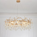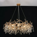 The  water drop chandelier is made of brass and glass drops, This artistic lighting fixture features a center area where life-like branches start to twist and turn from, covered with a luxurious brass finish. Multiple light bulbs provide the dramatics of light rays glistening through the crystal droplets.