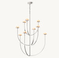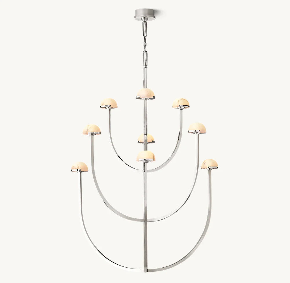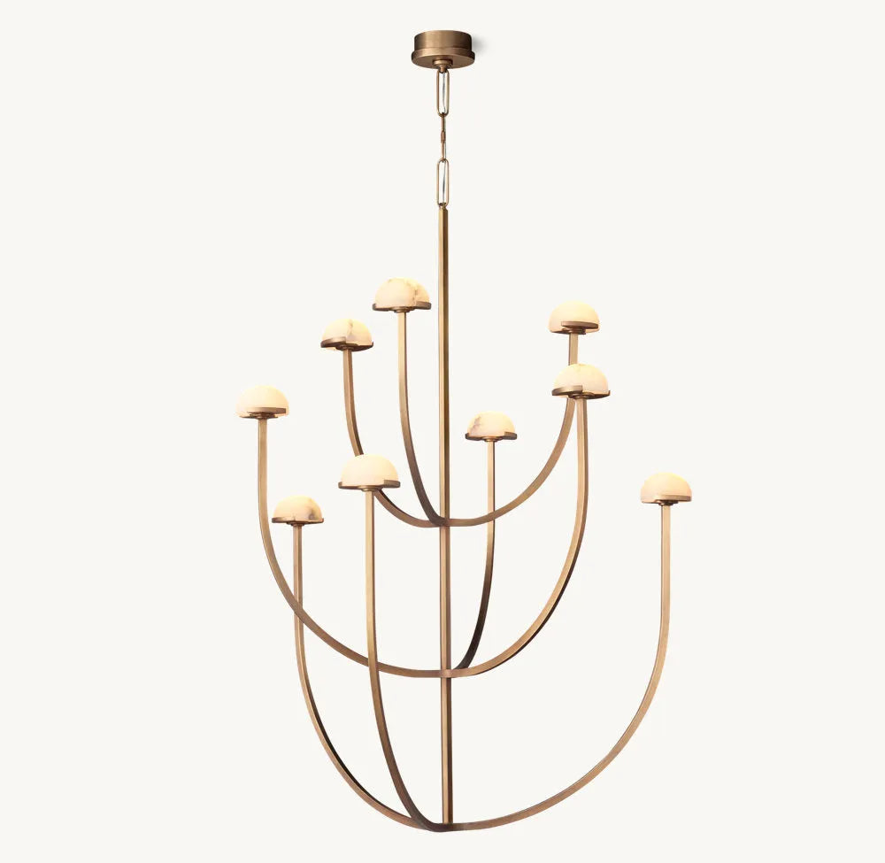 Minimalist in design yet maximalist in effect, our lighting collection was inspired by a midcentury Italian silhouette. Metal armatures reminiscent of architectural tracery support a constellation of dome-shaped, translucent alabaster shades that highlight the stone's natural veining and coloration. The sculptural form emits a warm, filtered glow.