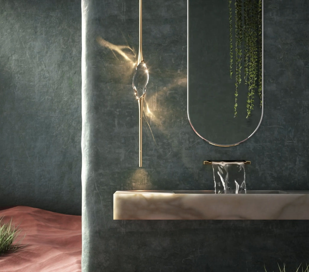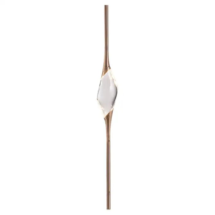Il Pezzo 12 is a female figure suspended in the air. carrying in her womb the light.‎ It’s nimble. refined. addictive.‎ The solid crystal. illuminated by LEDs. creates suggestive refractions and it’s suspended between brass stems finished in contrasting colours.‎