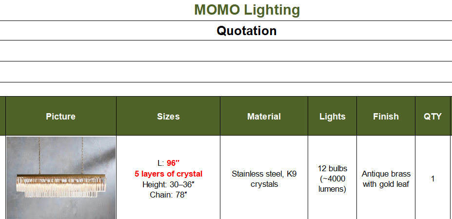 3. The specific size about the width, depth and height, like W 32” X D 10” X H 10”. Not sure what size to choose for your space? No worries, check out this detailed chandelier size guide blog that we wrote which should be able to answer most of your chandelier size questions and guide you to choose the right size.