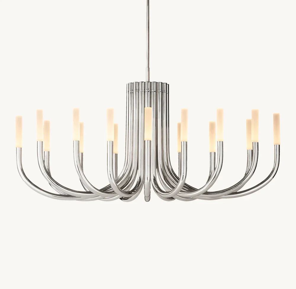 Inspired by minimalist midcentury Italian design, our contemporary interpretation of the chandelier offers reductionist form in a striking silhouette. Spare and understated, Rousseau's gracefully upraised arms hold aloft an etched glass shade fitted with an integrated LED bulb. When lit, the fixture emits a warm, filtered glow.