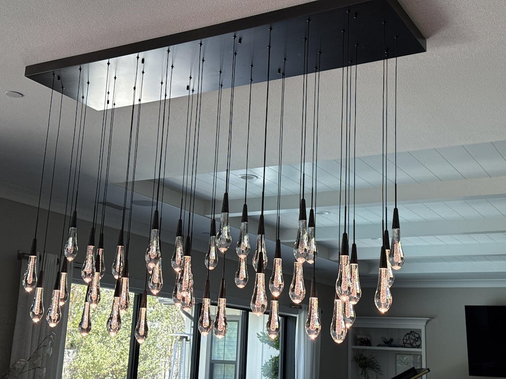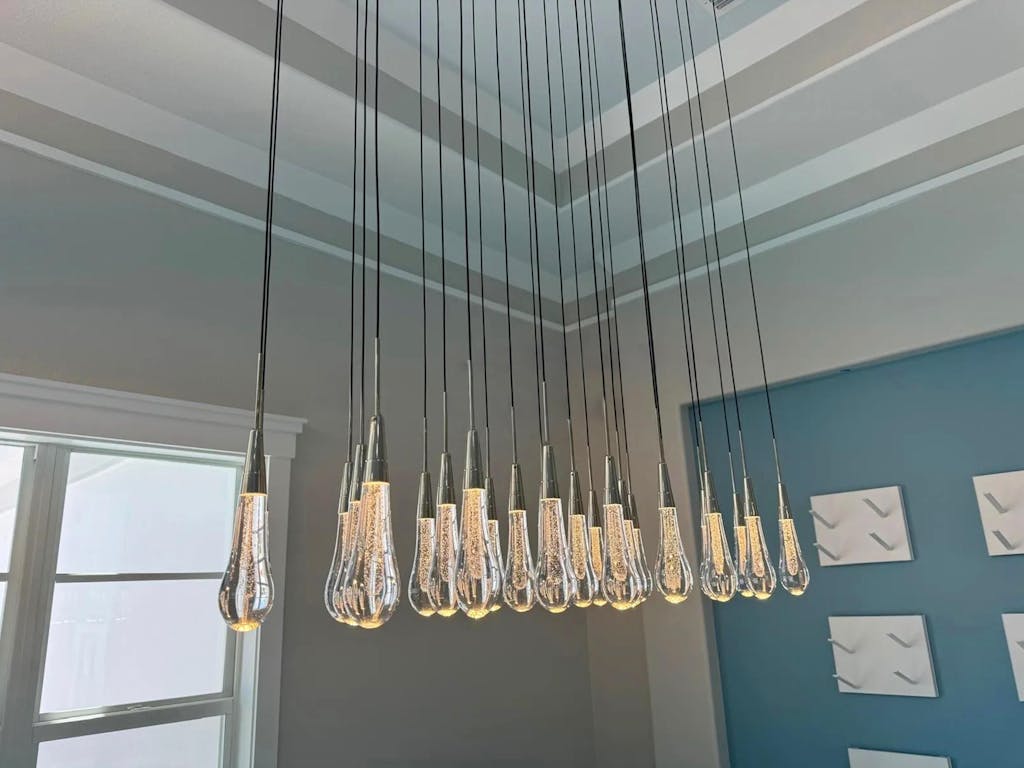 Featuring adjustable black PVC cords cascading into integrated LED lights handcrafted from seeded glass, our Soltaire Lighting Collection mimics the look of a fallen raindrop.